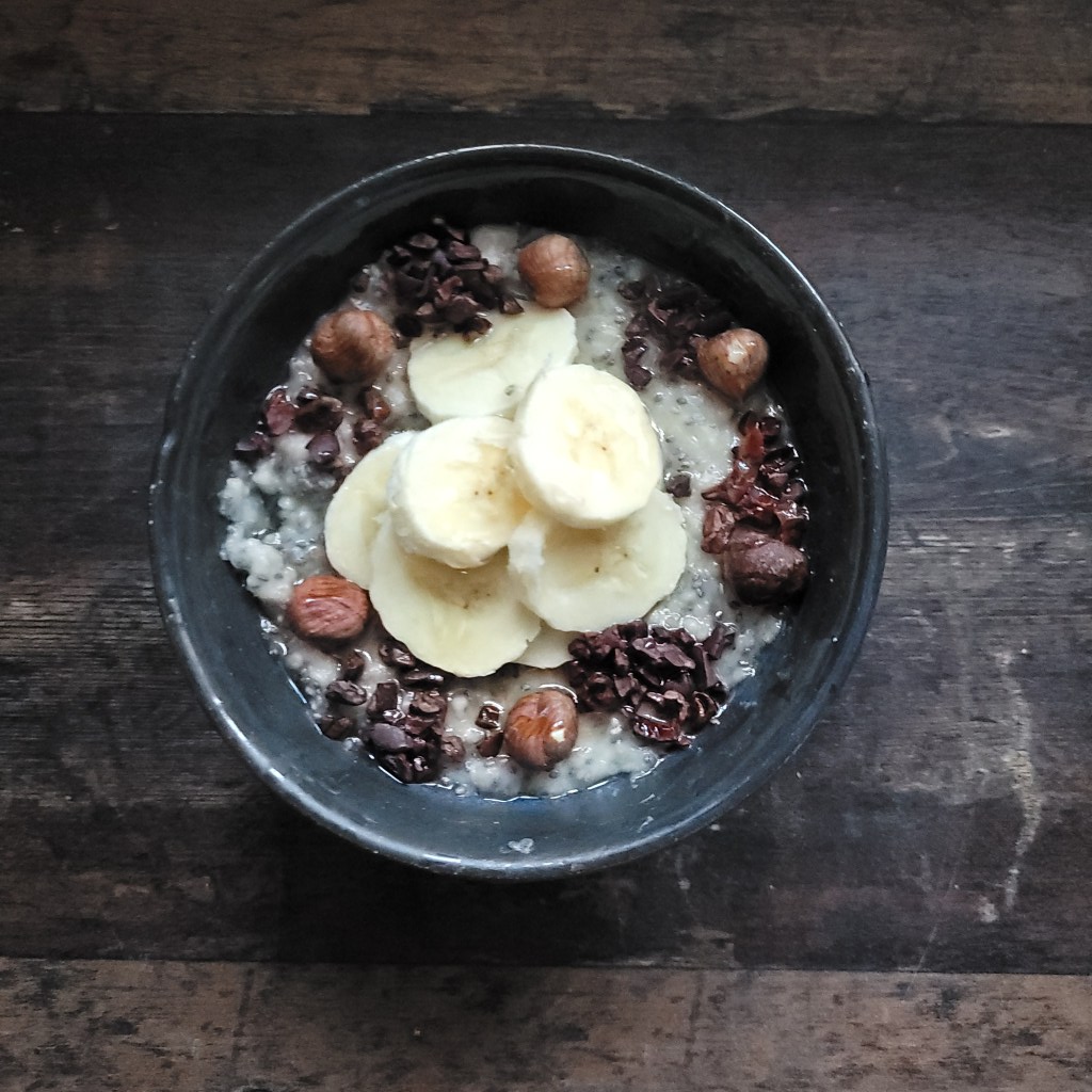 Top the cooked porridge with the banana, cacao nibs and hazelnuts.
