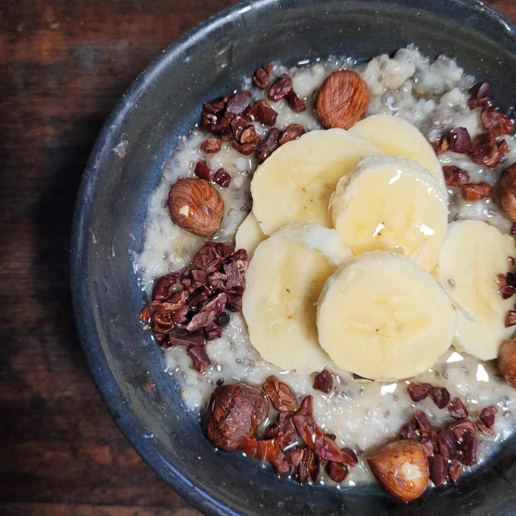 Add some chia seeds to your porridge for added protein, top with banana, hazelnuts and cacao nibs, and you have a breakfast fit for a warrior.