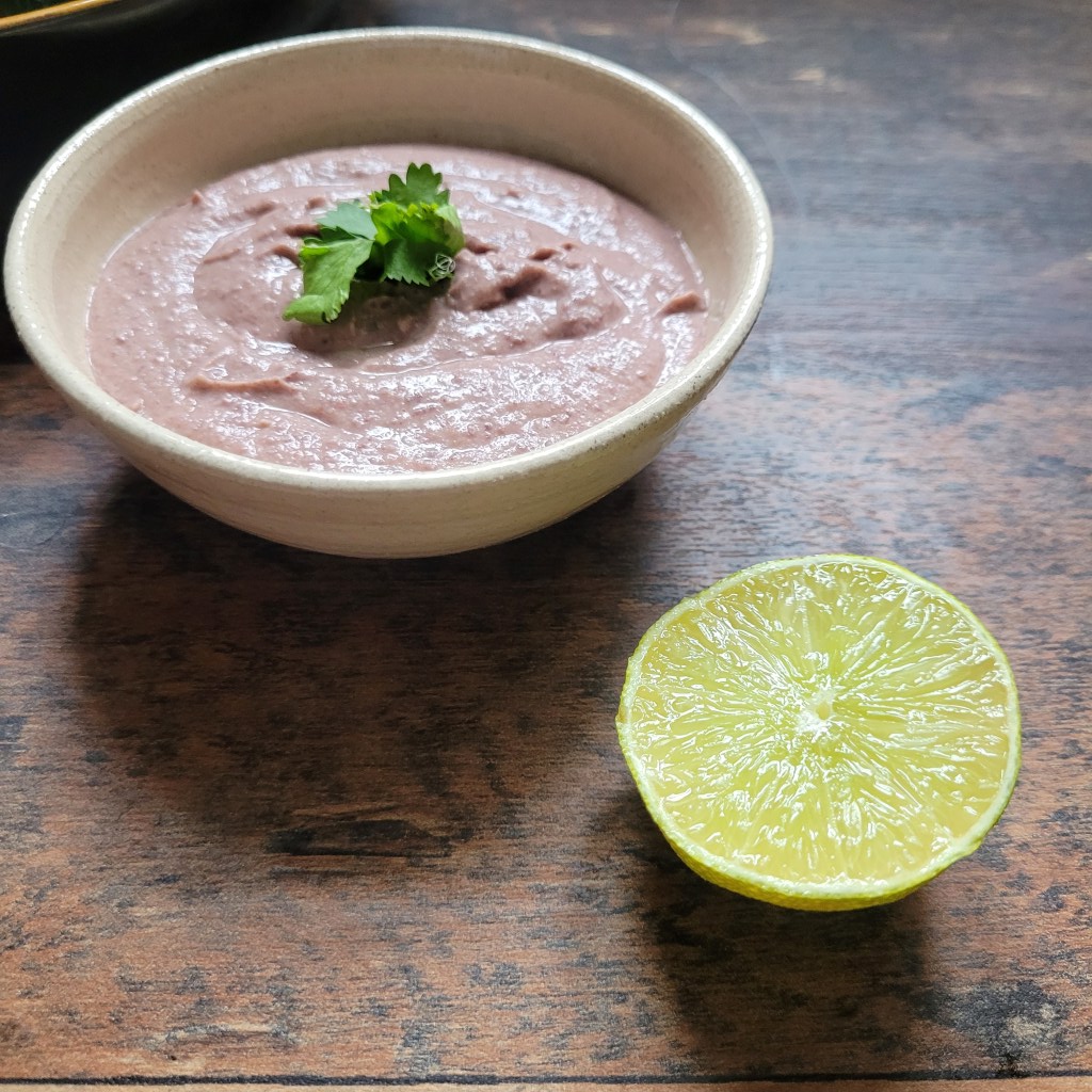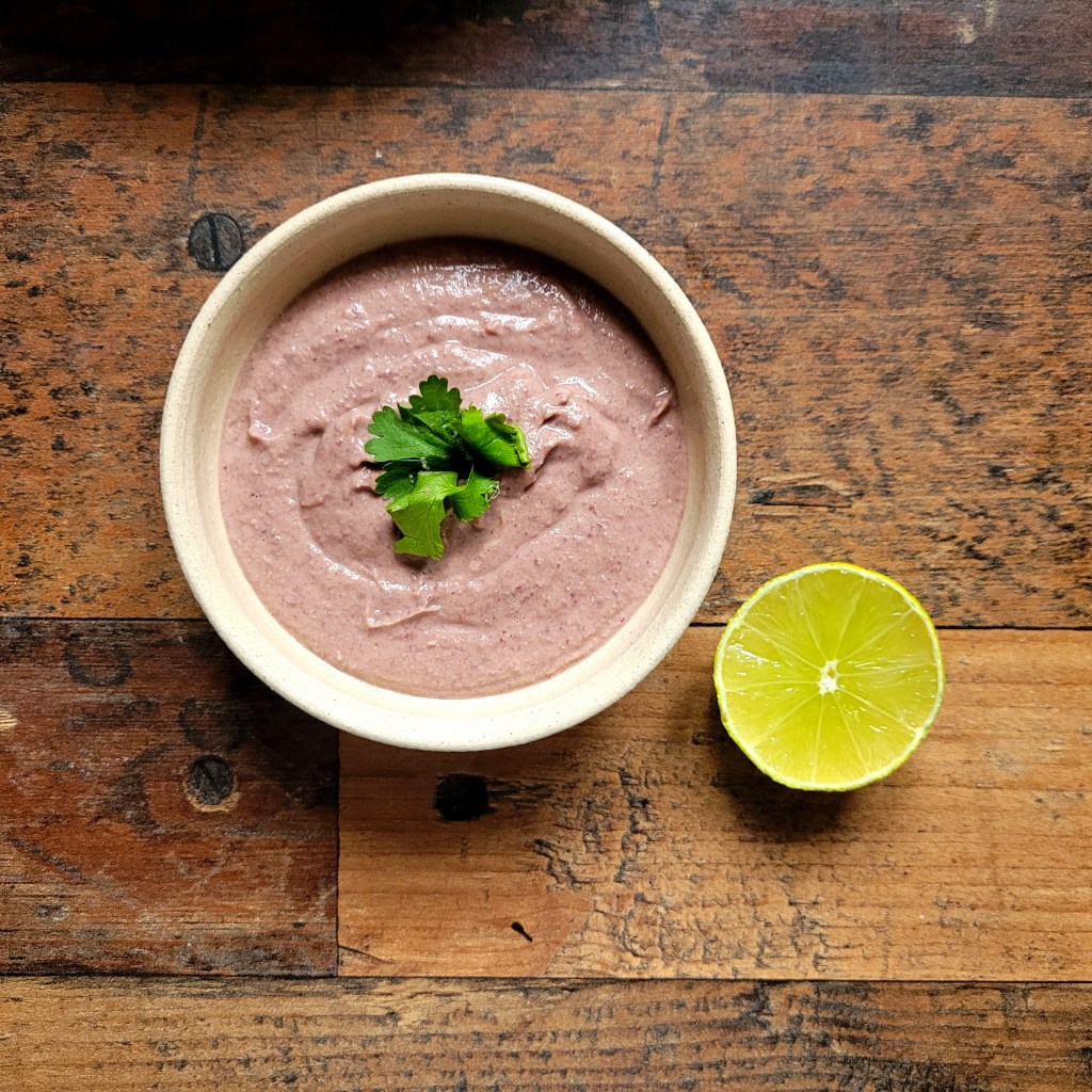 In a high powered blender, add the black beans, tahini, lime juice and garlic with a splash of water and blend until smooth.