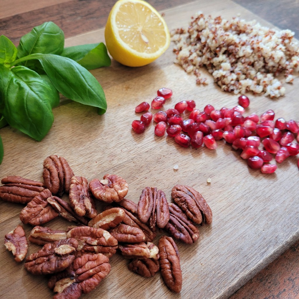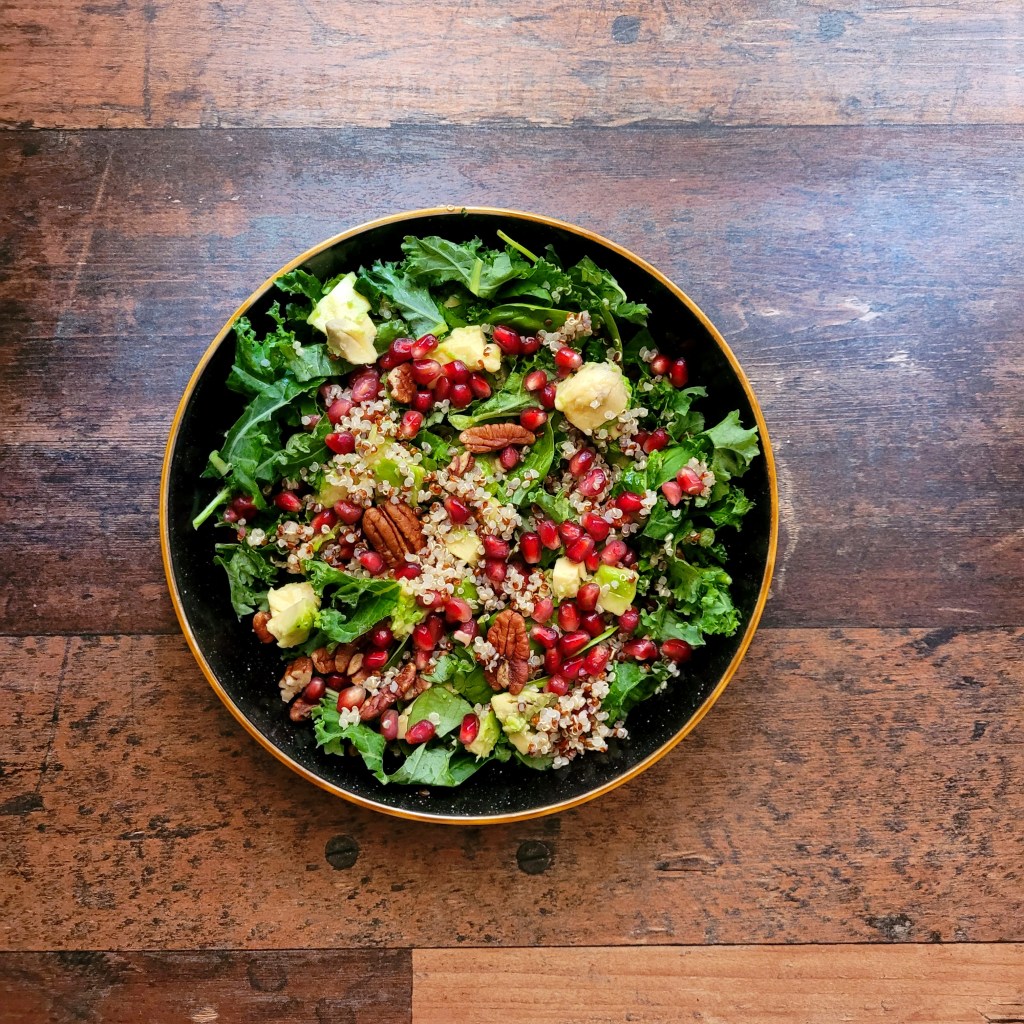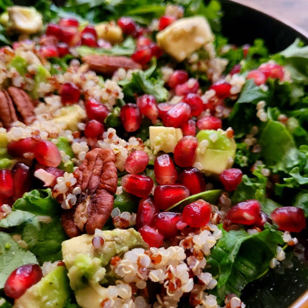 Now if this doesn’t scream Summer, I don’t know what will. A beautiful combination of sweet juicy pomegranate with earthy crunchy pecans, on a bed of kale and quinoa. Perfect.