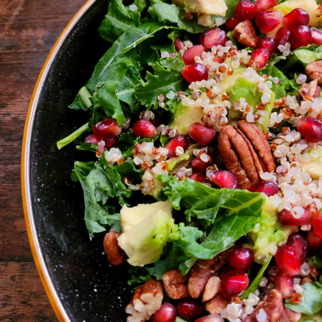 This is such a simple recipe that can be mixed up depending on what ingredients you have to hand. Substituting the pomegranate for peach slices and the pecans for toasted walnuts also works wonderfully. You could use any greens instead of kale. Baby spinach is wonderful. Just note that you don’t need to rub the spinach with the lemon and salt like you would with the kale.