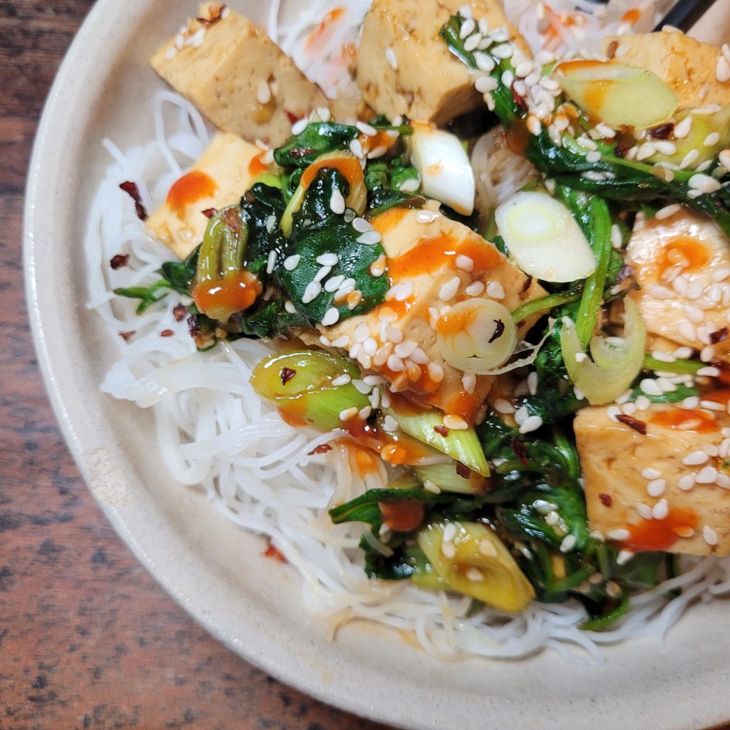 Tofu, soy, Sriacha with rice noodles and spring onions. A very quick and satisfying midweek meal that can be adapted to what you have lying in the fridge.