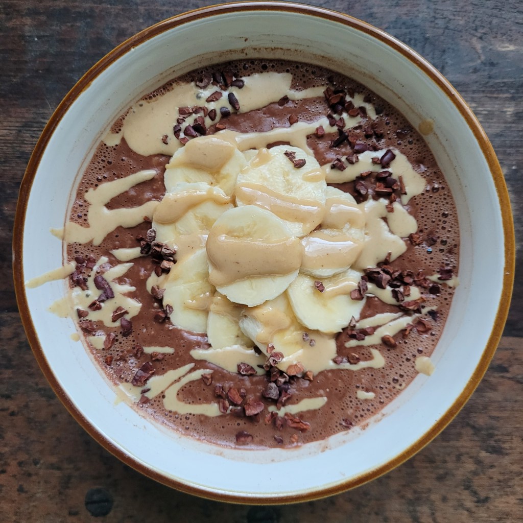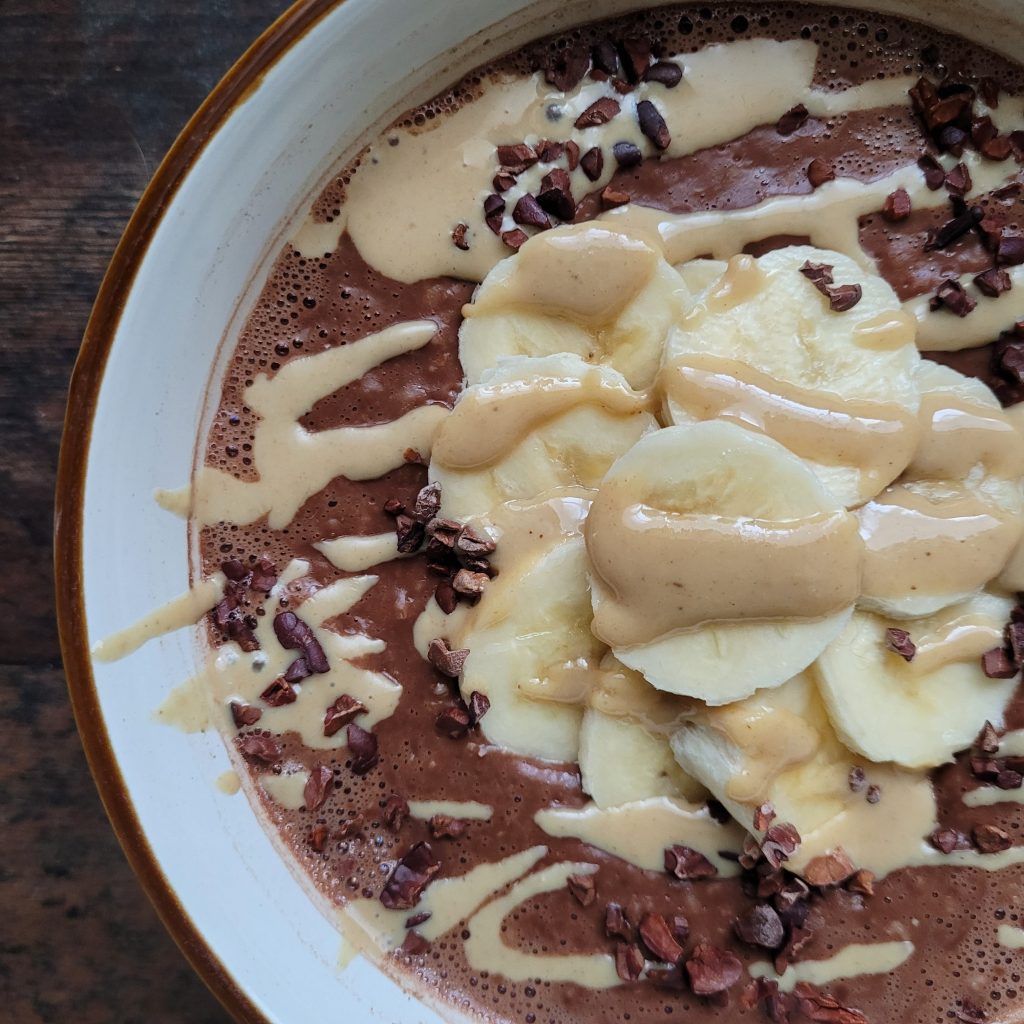 Remove from the microwave, top with sliced banana, peanut butter drizzle and cacao nibs.