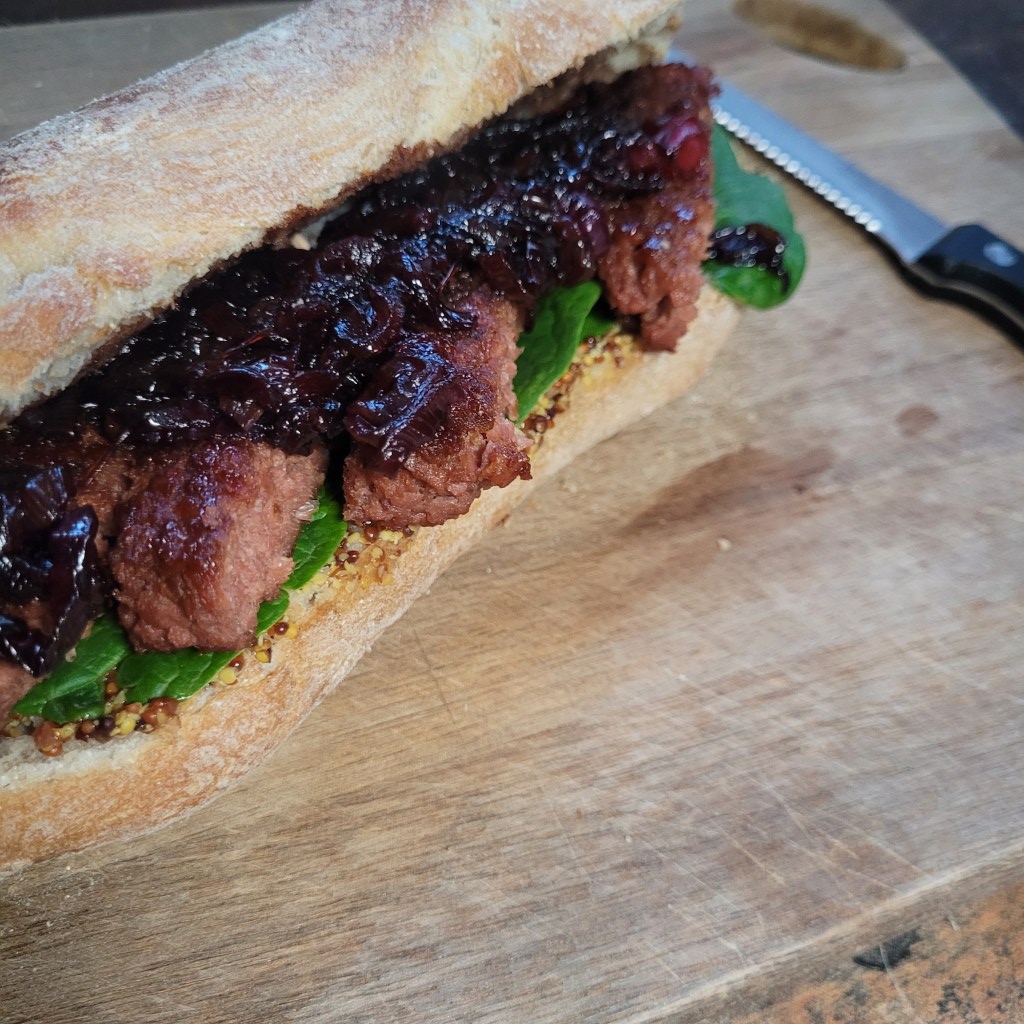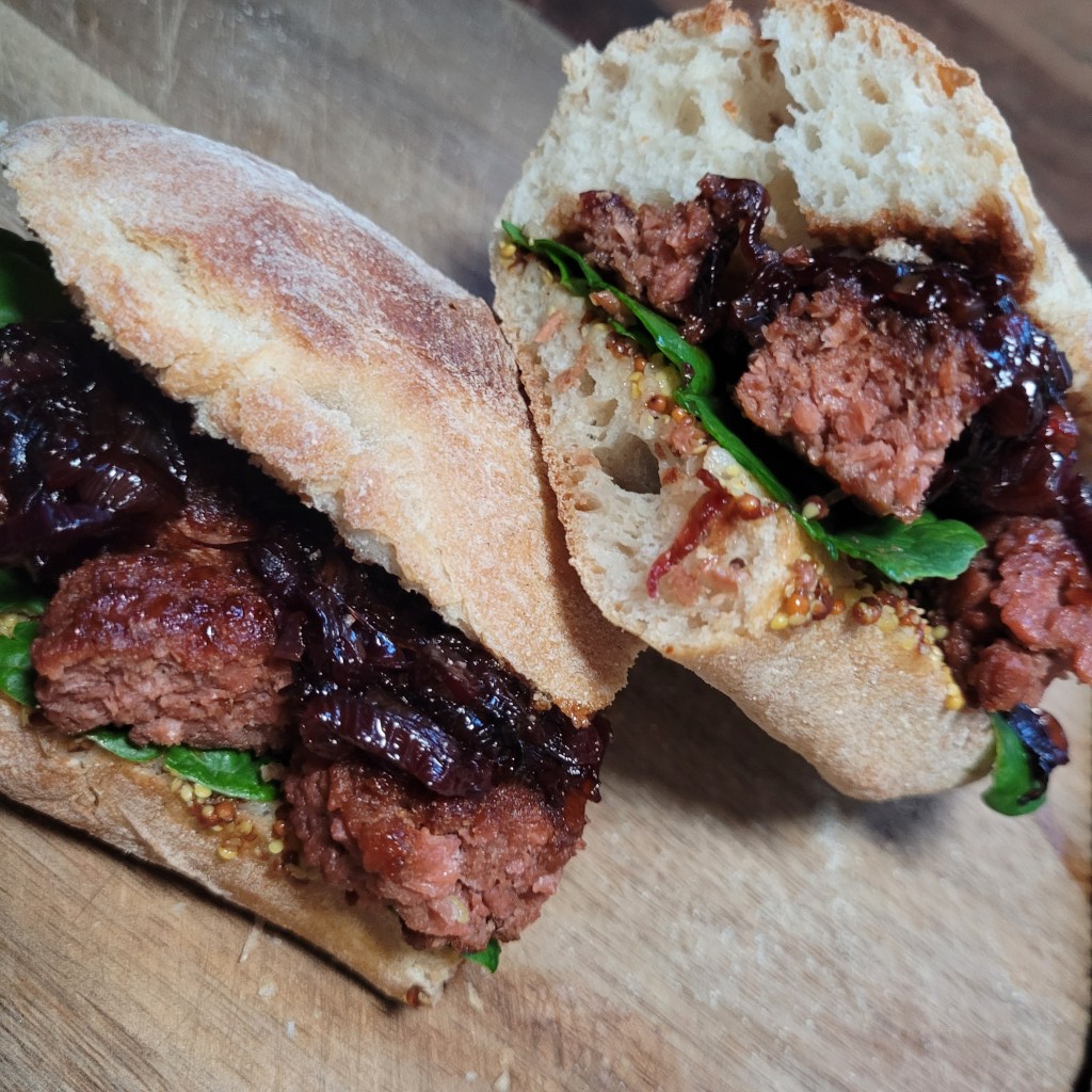 Using Beyond Burgers to recreate a classic steak sanwich on a beautfully crisp ciabatta loaf with mustard and caramelised onions.