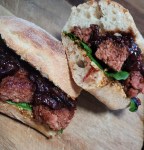 Using Beyond Burgers to recreate a classic steak sanwich on a beautfully crisp ciabatta loaf with mustard and caramelised onions.