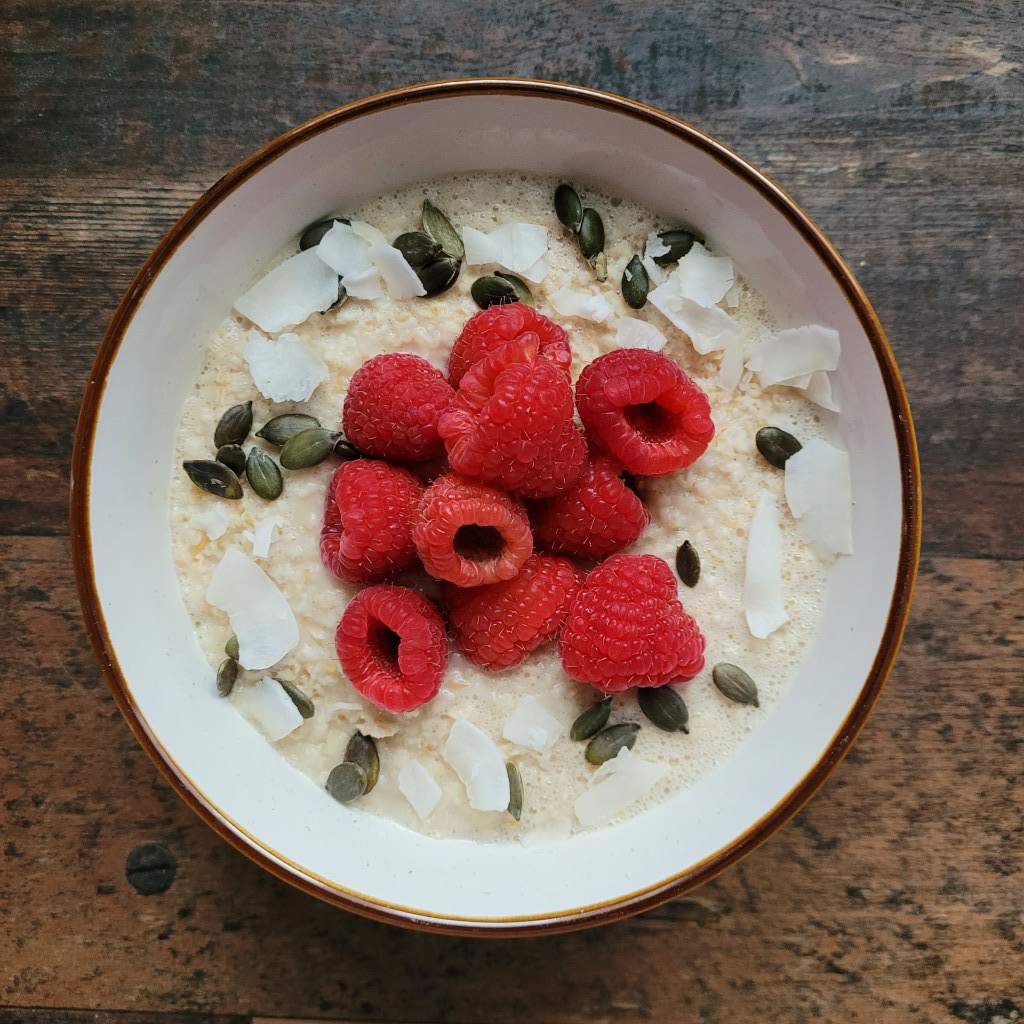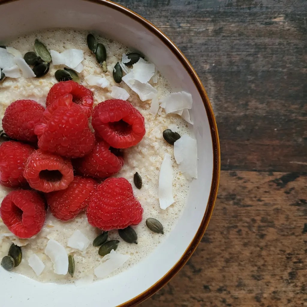 Porridge topped with raspberries, pumpkin seeds and coconut.
