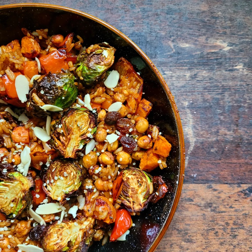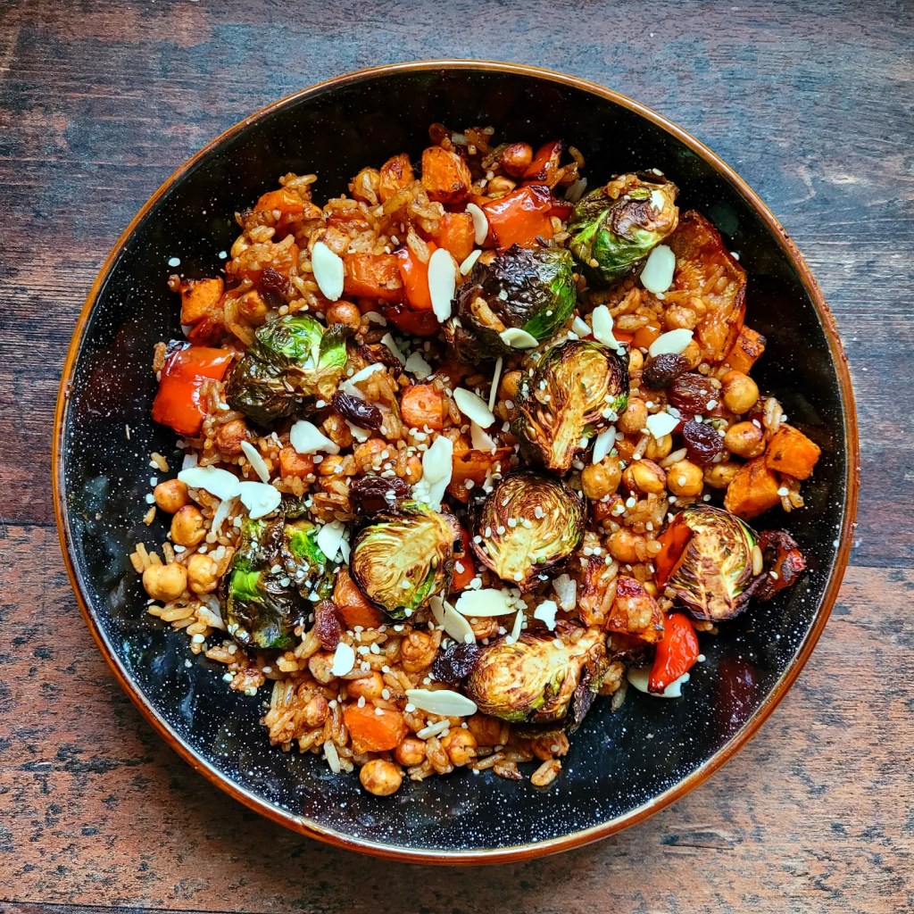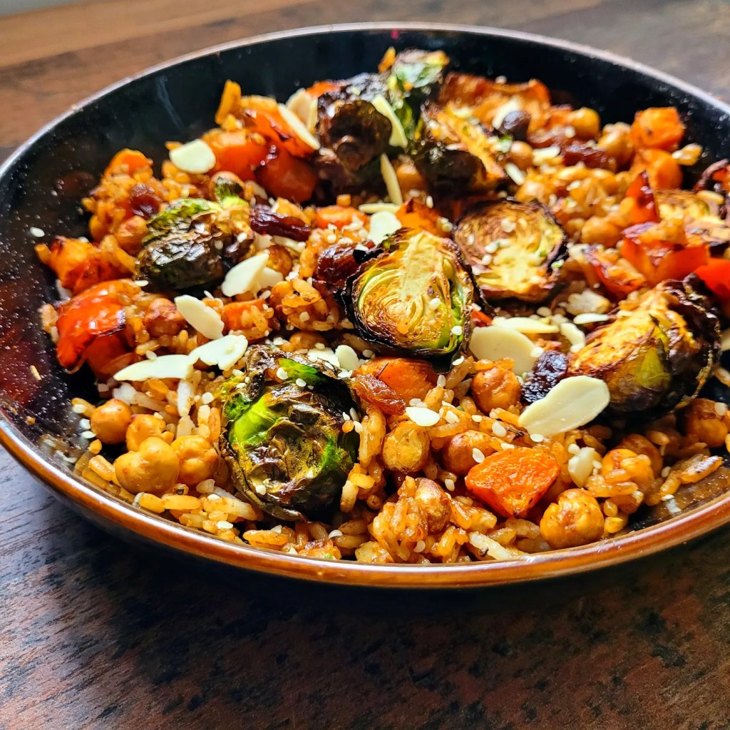 Sprinkle a good amount of Cajun seasoning and 2tbsp of olive oil over 1/2 cup chickpeas, 1/2 cup sweet potato, 1 red pepper chopped, and 1 cup of sprouts and roast in an oven on air fryer for 20 minutes until nice and crispy. In a large bowl, add 1/2 cup cooked rice, 1/2 tsp Cajun seasoning, the cooked sprouts, pepper, sweet potato and chickpeas, and give everything a good mix. Add some sultanas, hemp seeds and flaked almonds and serve.