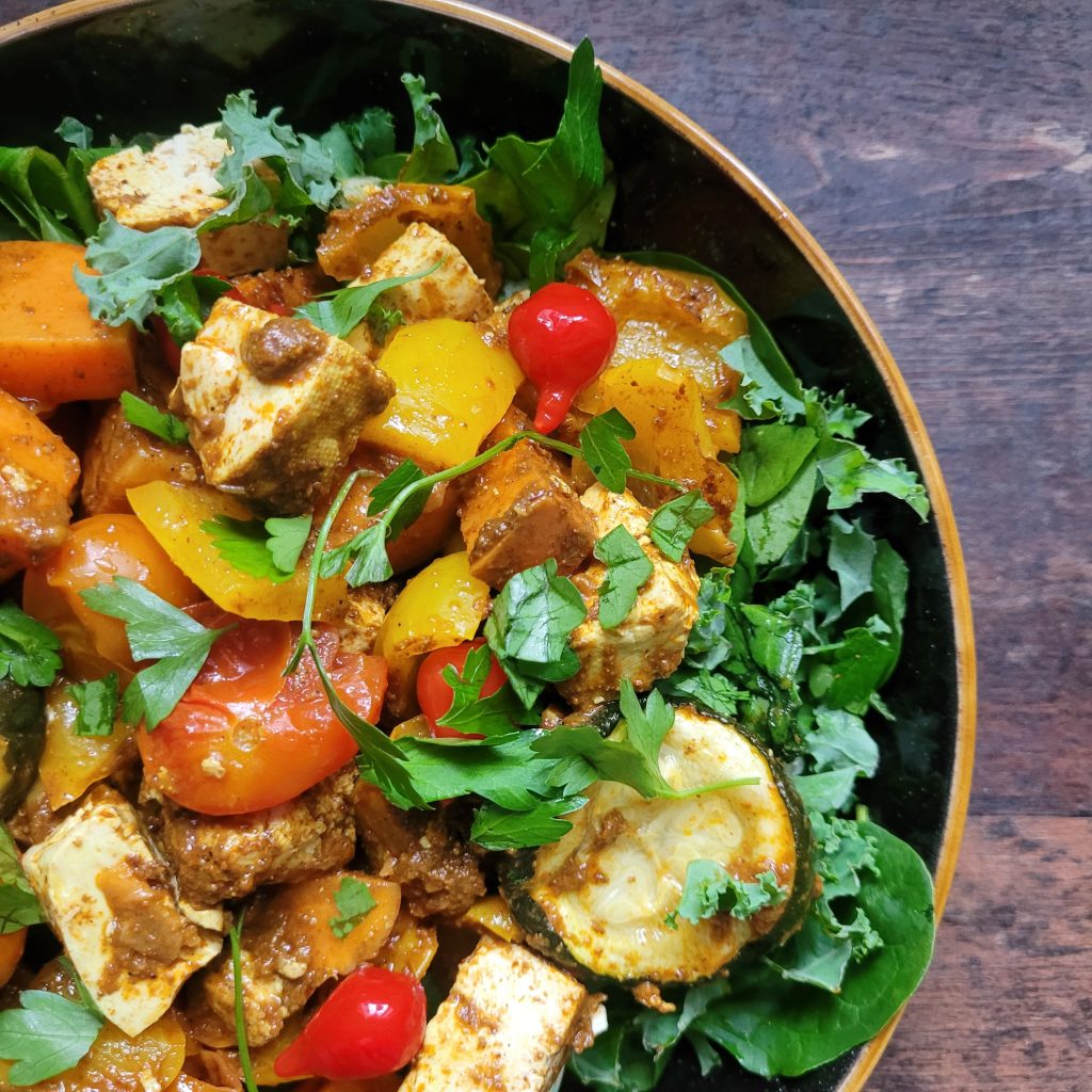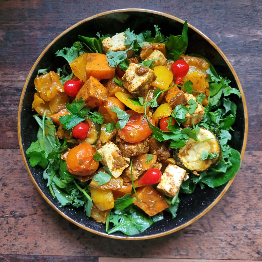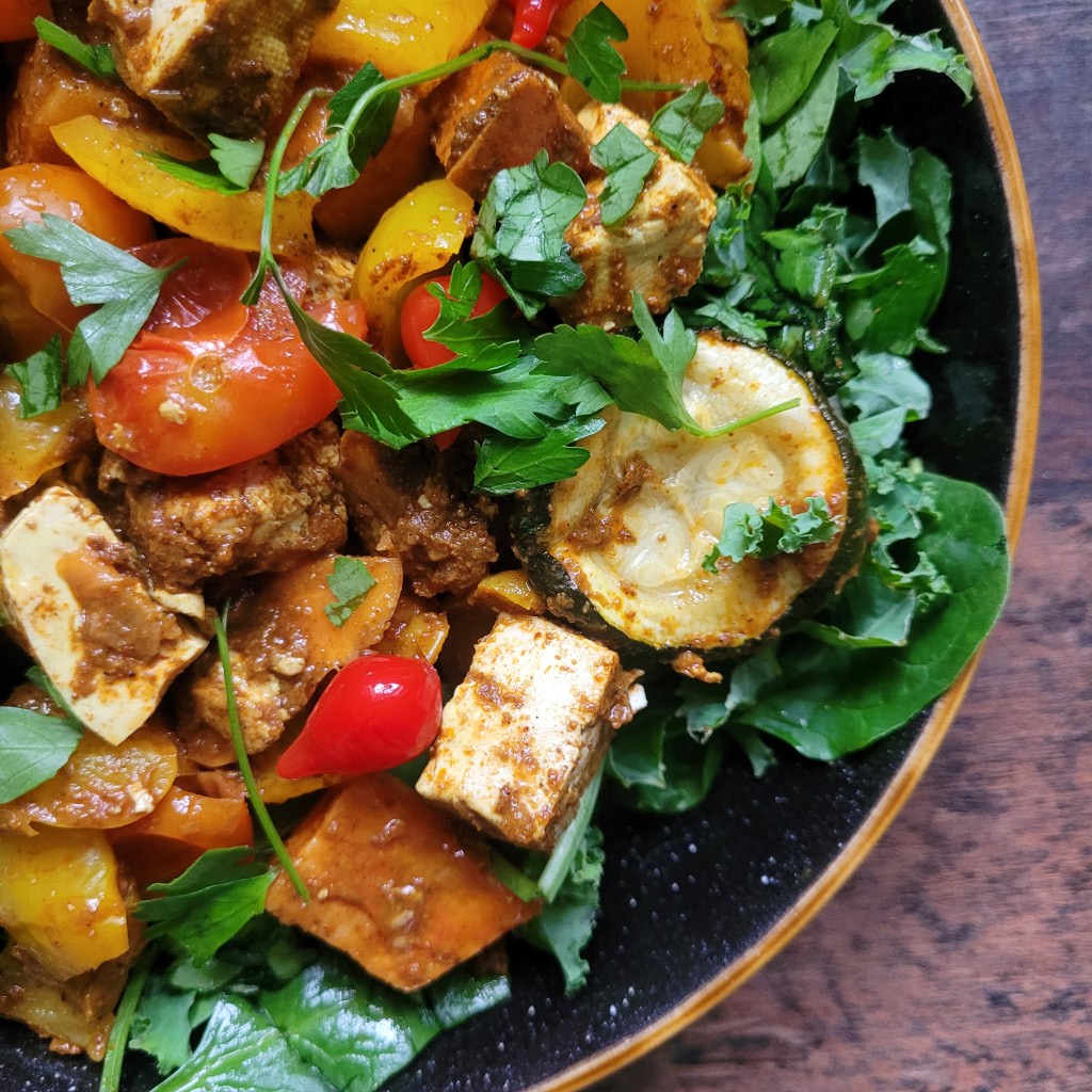A one pan dish, coating the tofu and vegetables in curry paste and roasting until beautifully tender and fragrant.