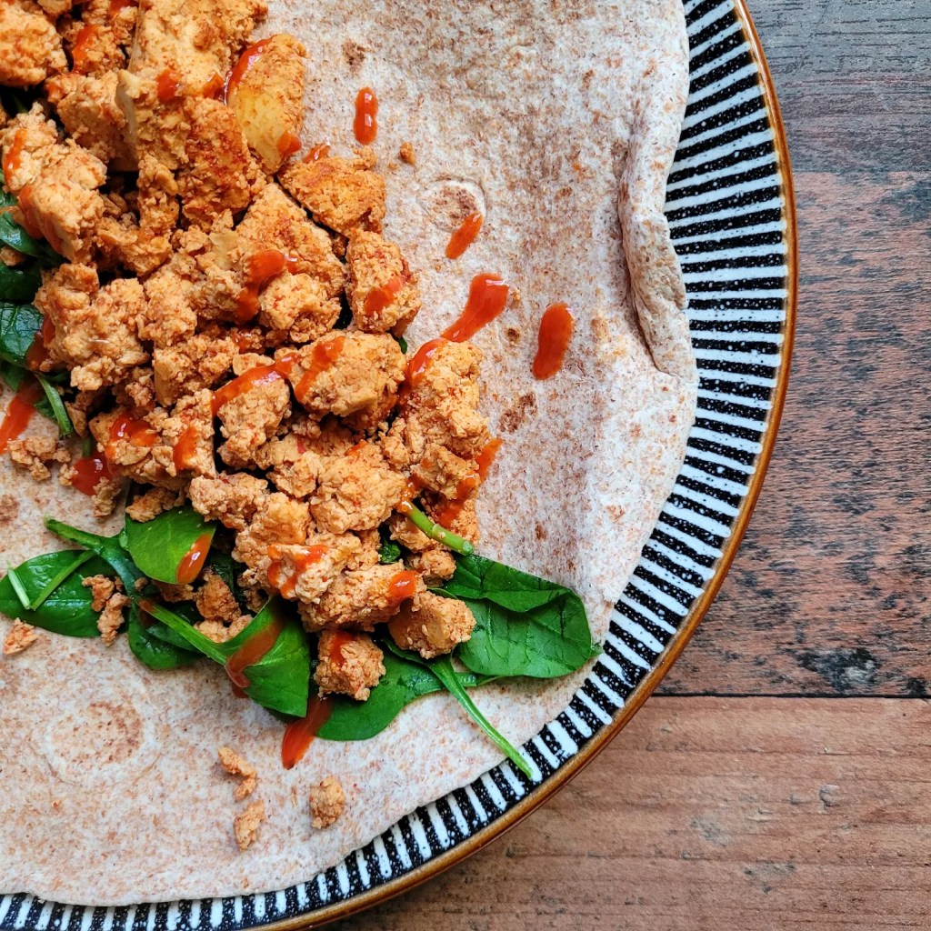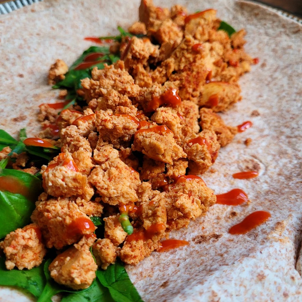 On a tortilla wrap, add spinach leaves and the top with the cooked crispy tofu. Drizzle some Sriracha sauce for some extra kick.
