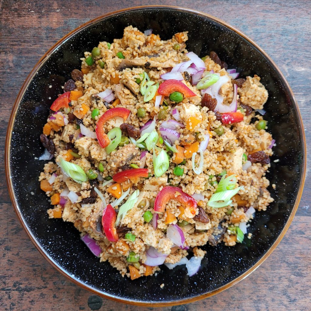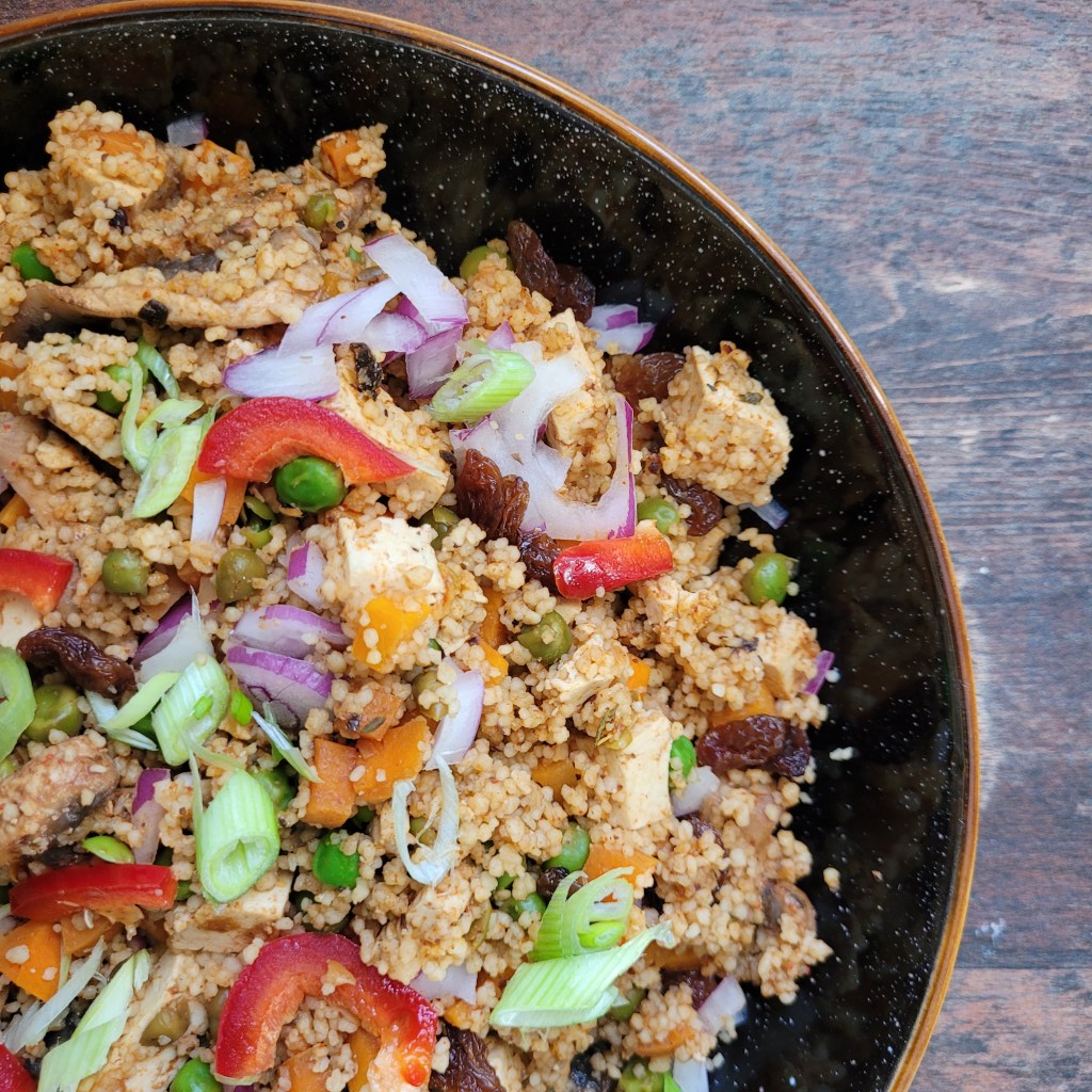 Each time I prepare this Lightly Spiced Cous Cous, I relish in the colourful blend of ingredients that converge in this dish. It’s a feast for the eyes and a treat for the taste buds. The bell peppers provide a delightful crunch, the peas and sultanas offer a surprising sweet note, while the tofu adds a wholesome element to the mix.