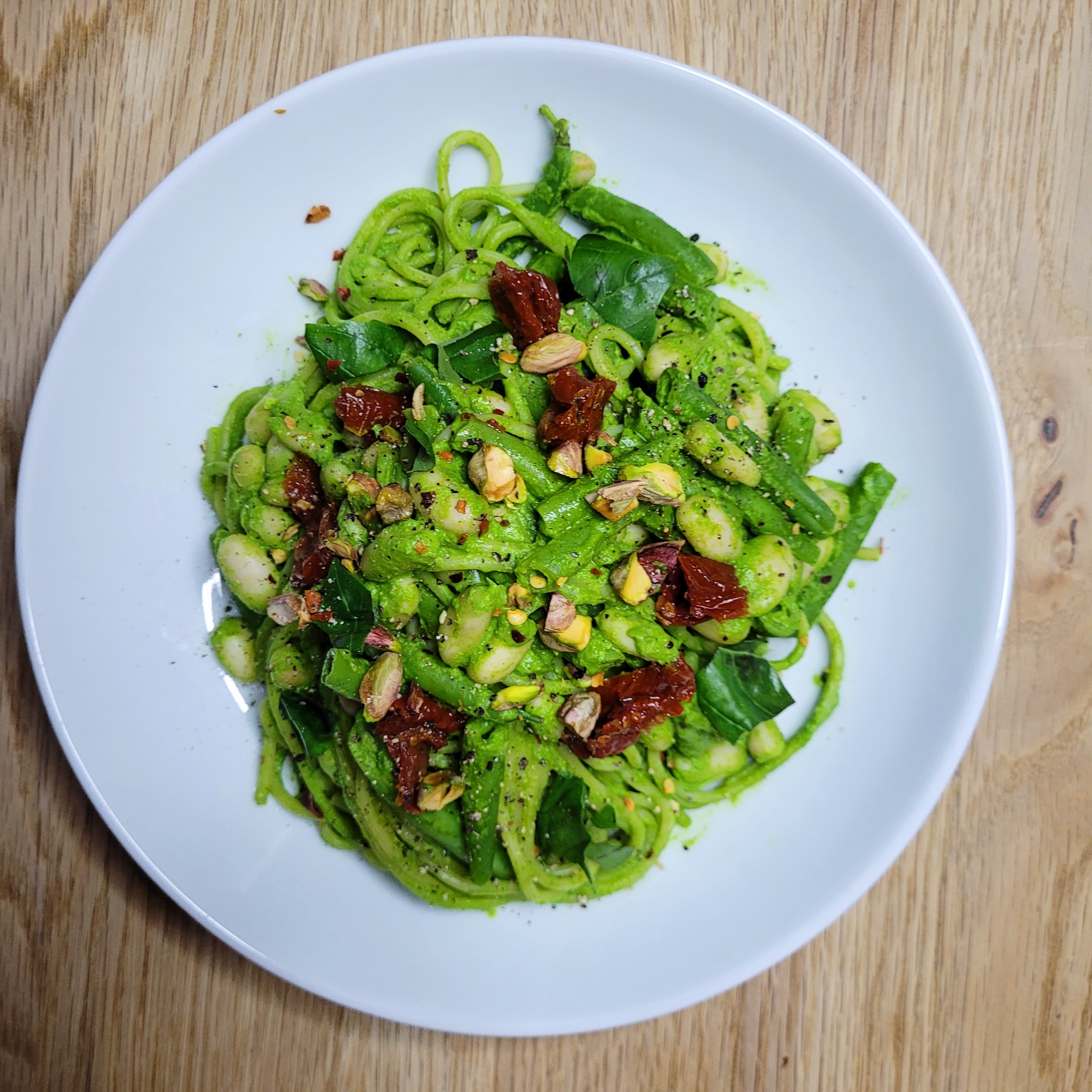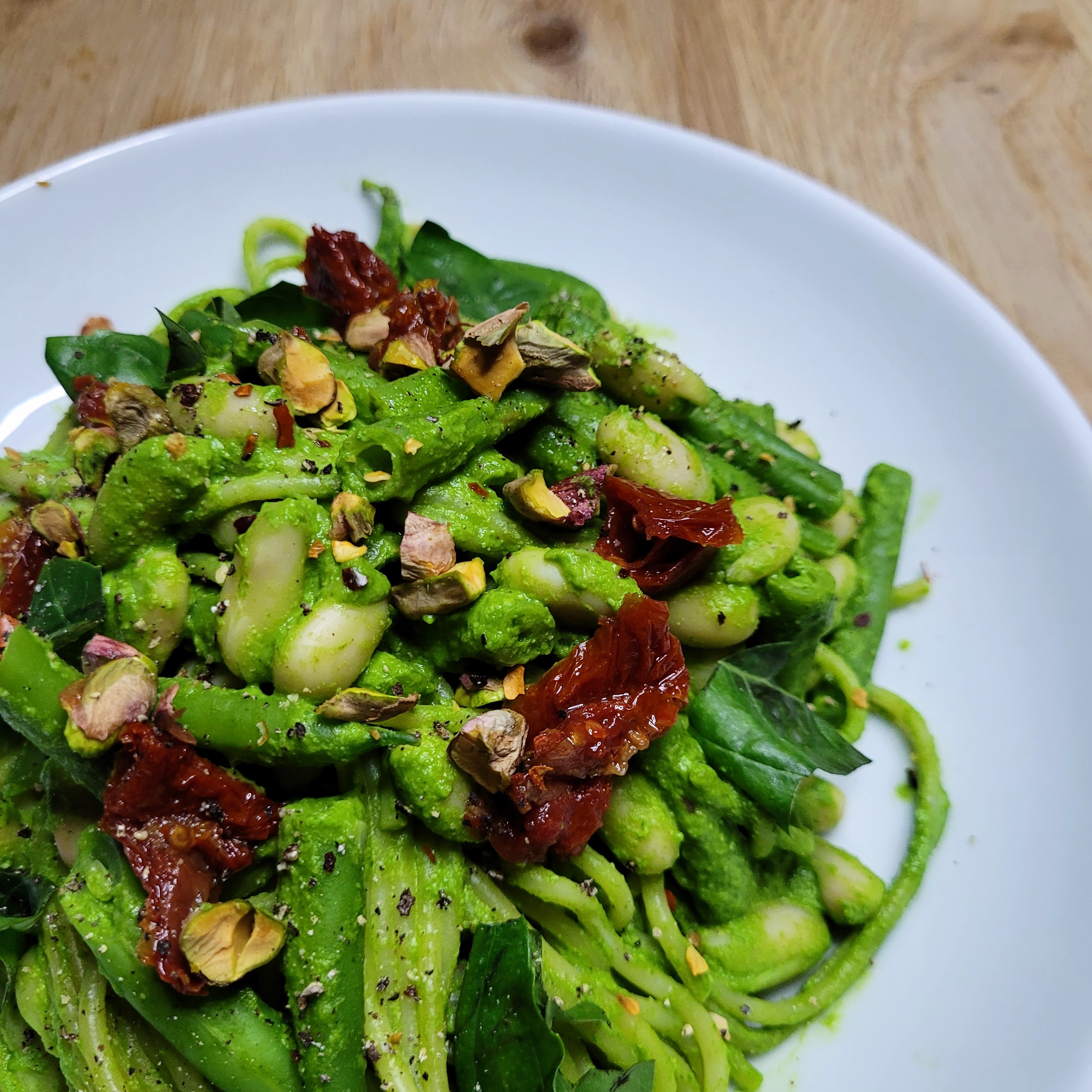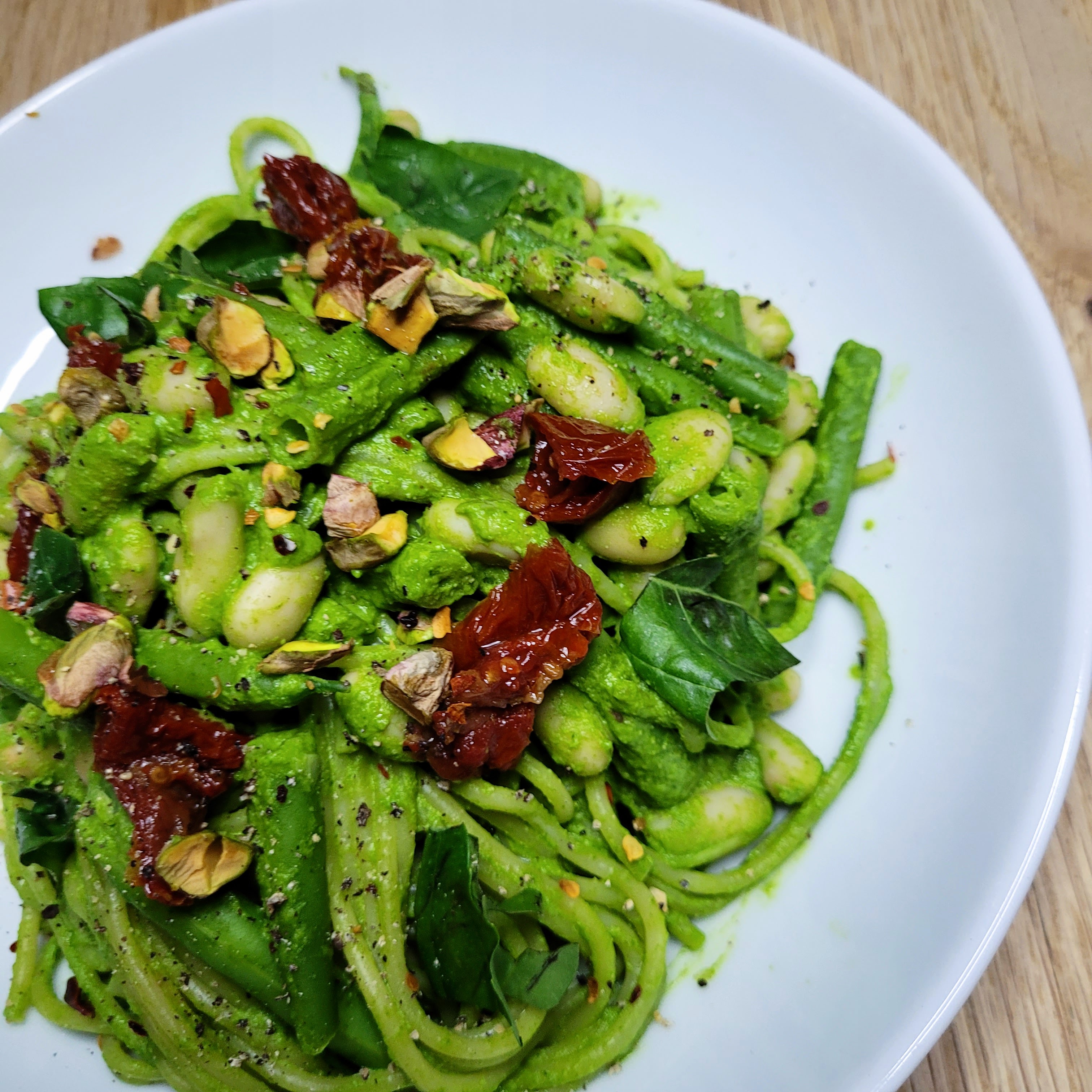 A delightfully nutritious dish that combines the richness of cashew-based pesto with fresh spinach and basil.