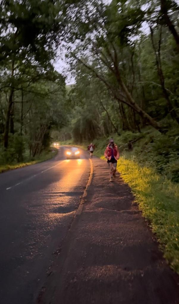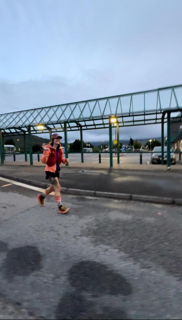 We finally reached the final wee climb, which meant it was all downhill along a fire track and down to the road into Fort William. This stretch was a whirlwind of emotions. The fire track terrain was annoying, gravely, and the decent again felt like it took forever, but it was exciting seeing the lights of Fort William in the distance, and daylight breaking through the clouds. We kept singing the A-Team theme music. Emily also took the opportunity to blast out Lizzo’s Feeling Good as Hell as we flew past some other runners, annoying them very much, by singing it at the top of our lungs. You gotta do what you gotta do! And I did feel as good as hell in those 5 minutes of singing. I never thought of anything else. It was honestly fun.