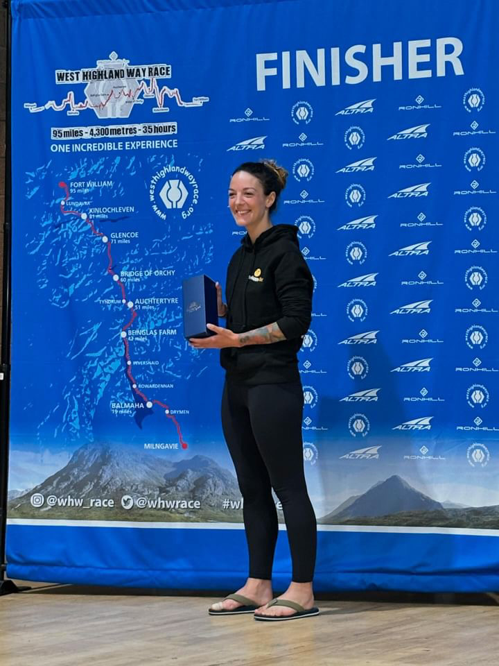 Then we hit the road, the longest road in the whole world. In that moment it was! If I was on my own, I most certainly would have walked this to the finish. But Emily just kept me driven, we never stopped, and looking back at my stats, the last km was the fastest km in the whole 157km! If you’re lucky enough to run the West Highland Way, be warned for this last km, following many yellow arrows, left, right, up, down, round and round, to eventually see the flags outside the Leven Centre. At 4:08am, I crossed the finish line, 27 hours and 8 minutes after I started.
