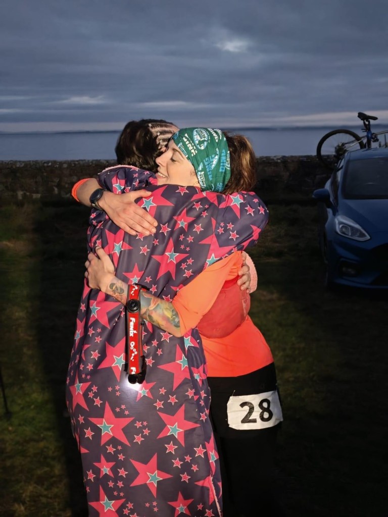 3 of us head out on yard 29, Martin “The Flash” Gordon was putting on an extraordinary show, for several hours he was adamant that yard was his last, yet he kept on showing up at the start line. But this time, it turned out 29 was indeed his last, leaving Vic and I to get that female assist and female win guaranteed! A little fist bump as we left the start, and agreed to run this lap together. The buzz we both had is something I’ll never be able to put in words. And so we just chatted and joked the whole way round, I let Vic lead the way on the last stretch, grateful to have feet to focus on, as I started to feel a bit of tiredness overcome me, perhaps the adrenaline was waning, but I knew a wee rest at the end of this yard would kick start things again. The whoop and cheers we got as we came in to finish that yard was amazing! I just couldn’t stop smiling!