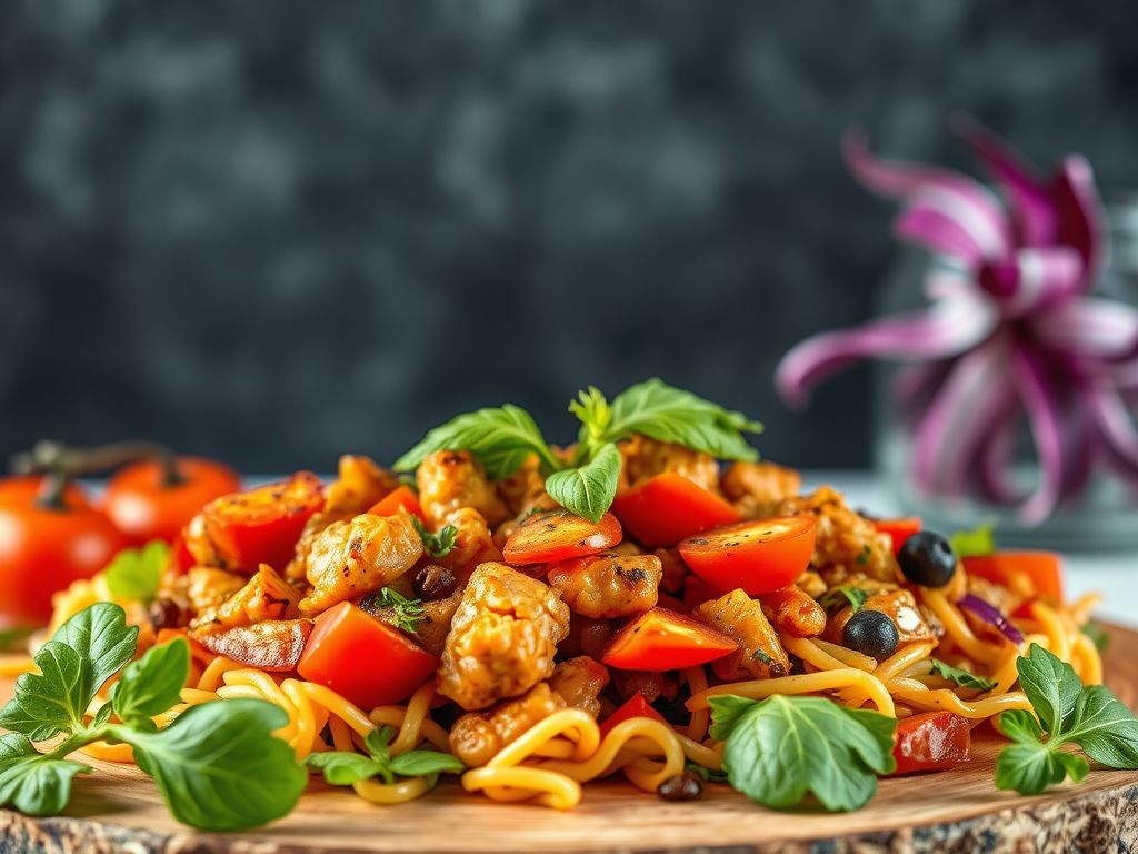 Ignite your taste buds with our plant-based spicy tomato sauce noodles, featuring sweetcorn, sesame seeds, and spring onions.